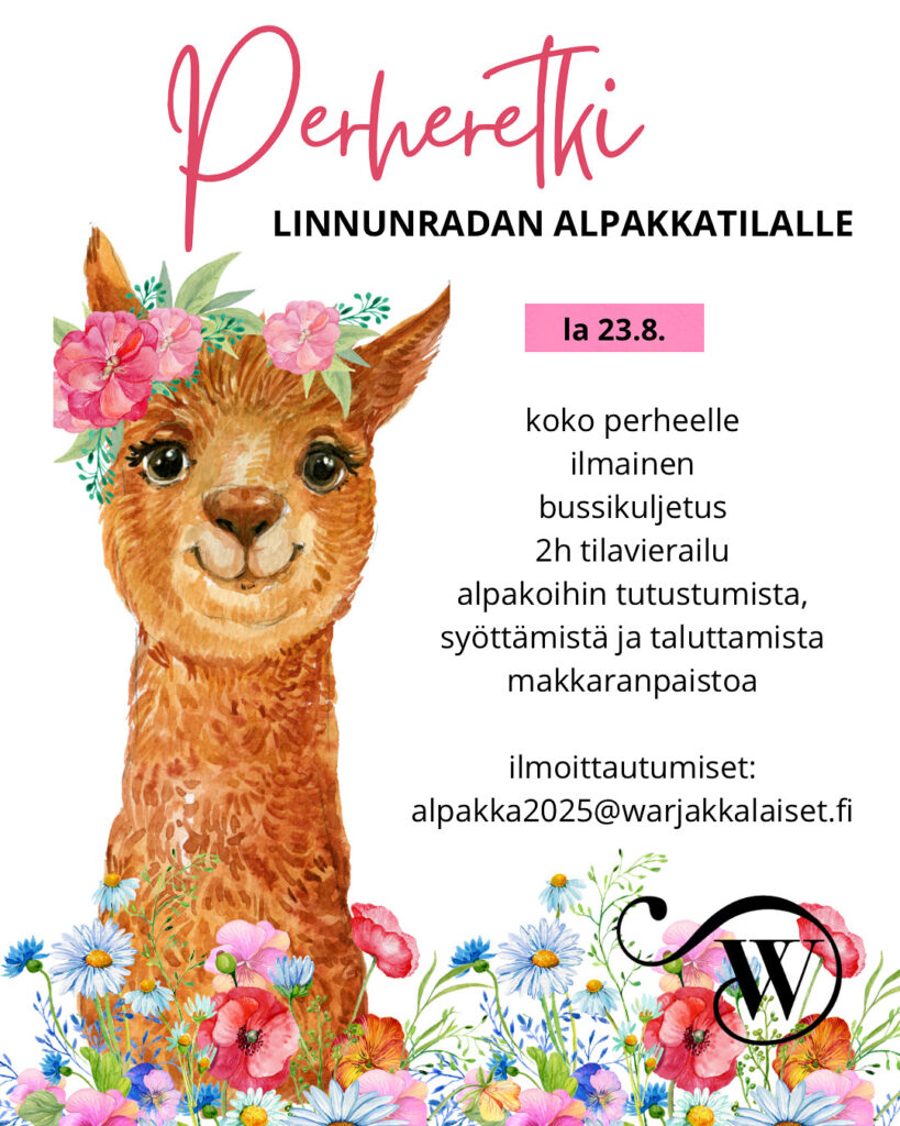 Ilmoittautumisia otetaan vastaan sähköpostilla osoitteeseen alpakka2025@warjakkalaiset.fi. Mukaan mahtuu 50 osallistujaa. Paikat täytetään ilmoittautumisjärjestyksessä.